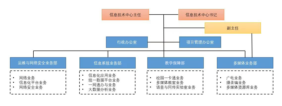 2011年11月,由原网络信息中心和教育技术中心合并组建成立现在的信息技术中心。目前,中心的业务职能主要涵盖信息化建设规划、数据治理、网络建设运维、一卡通建设运维、数据中心建设运维、软件系统开发、网络安全测评、信息技术支持服务、多媒体教学技术保障、广电系统建设运维、摄录编技术服务、多媒体资源库建设运维、信息素养培训及网络安全管理等工作。竭力为全校师生提供先进的数字化学习、工作及生活环境,努力打造智慧上外。下图是信息技术中心组织机构图。