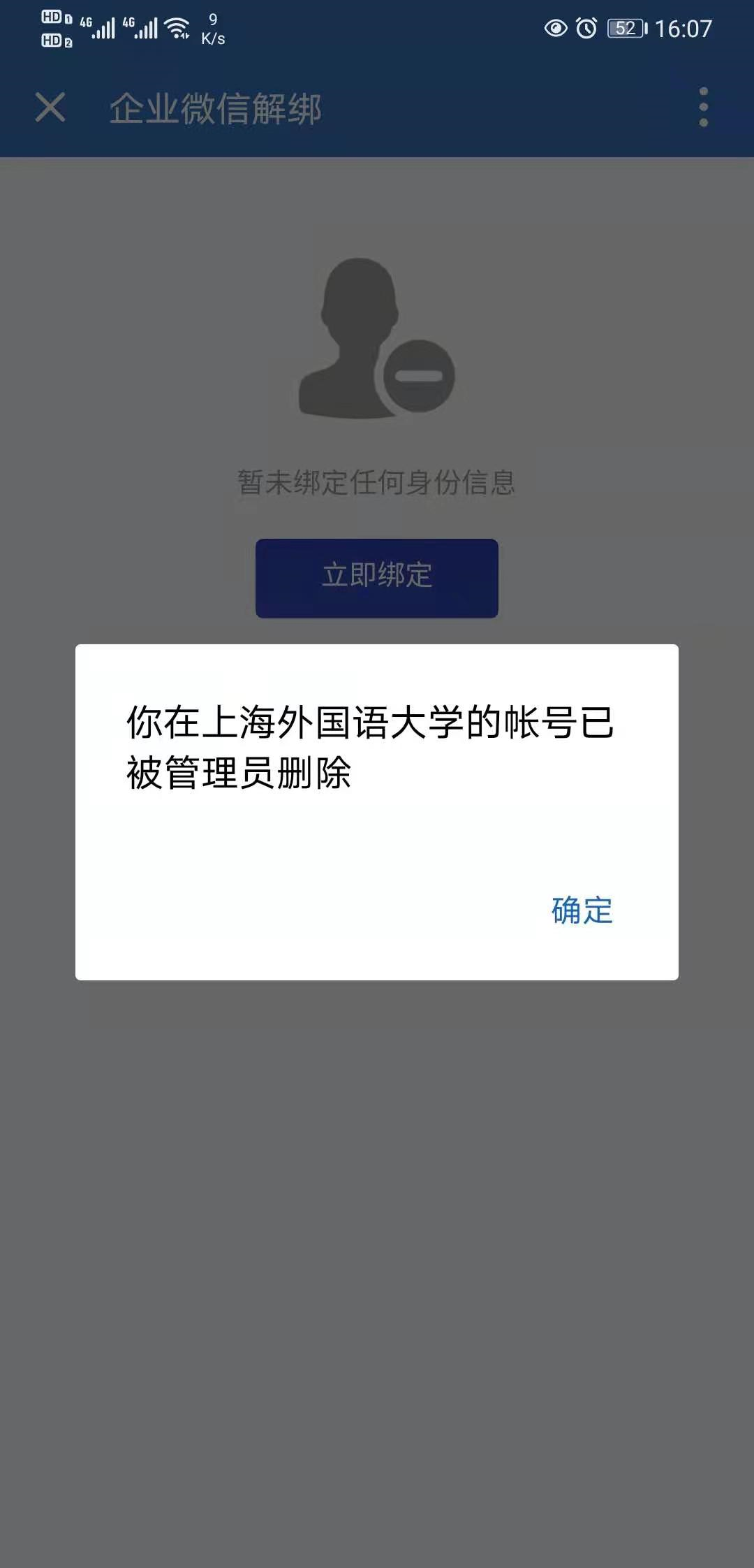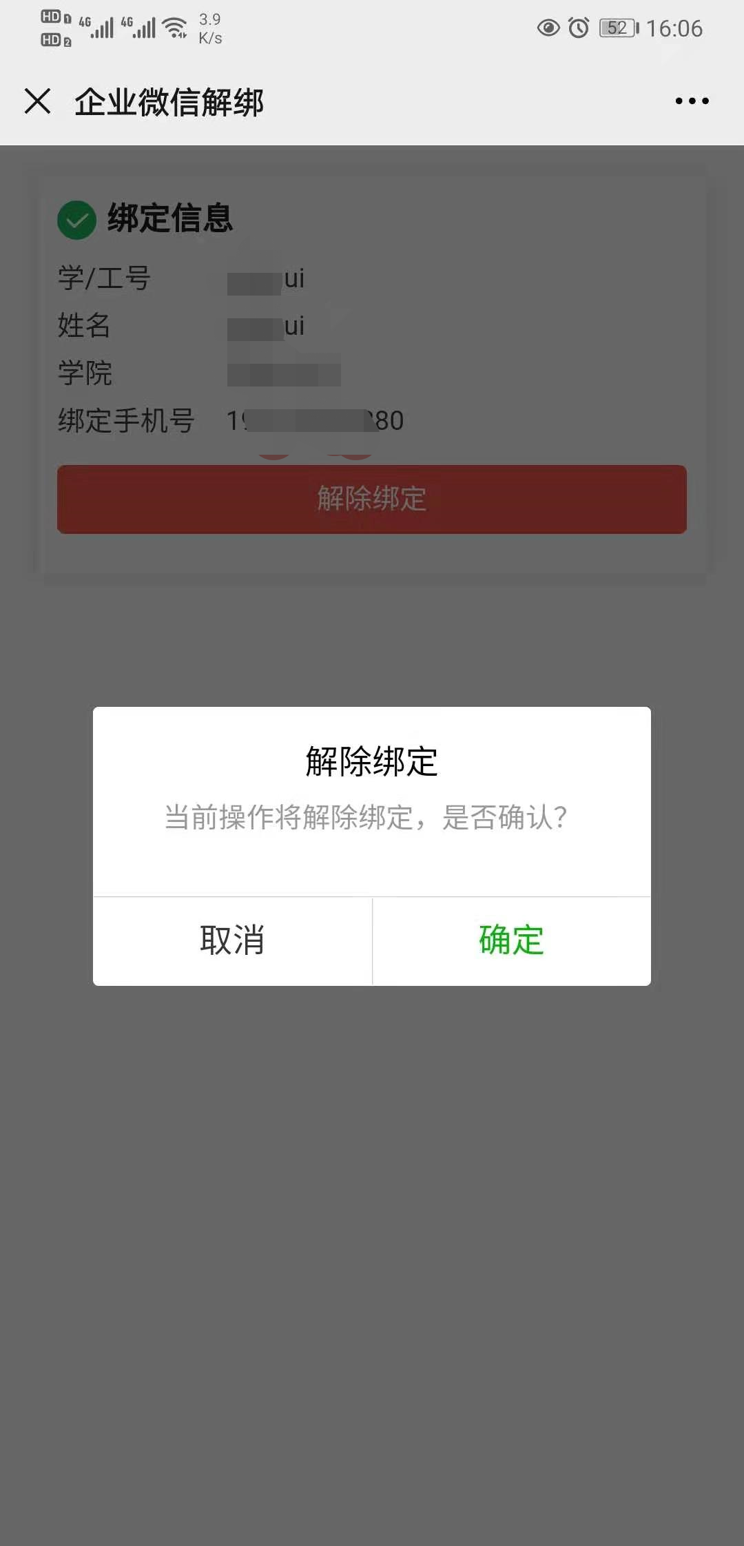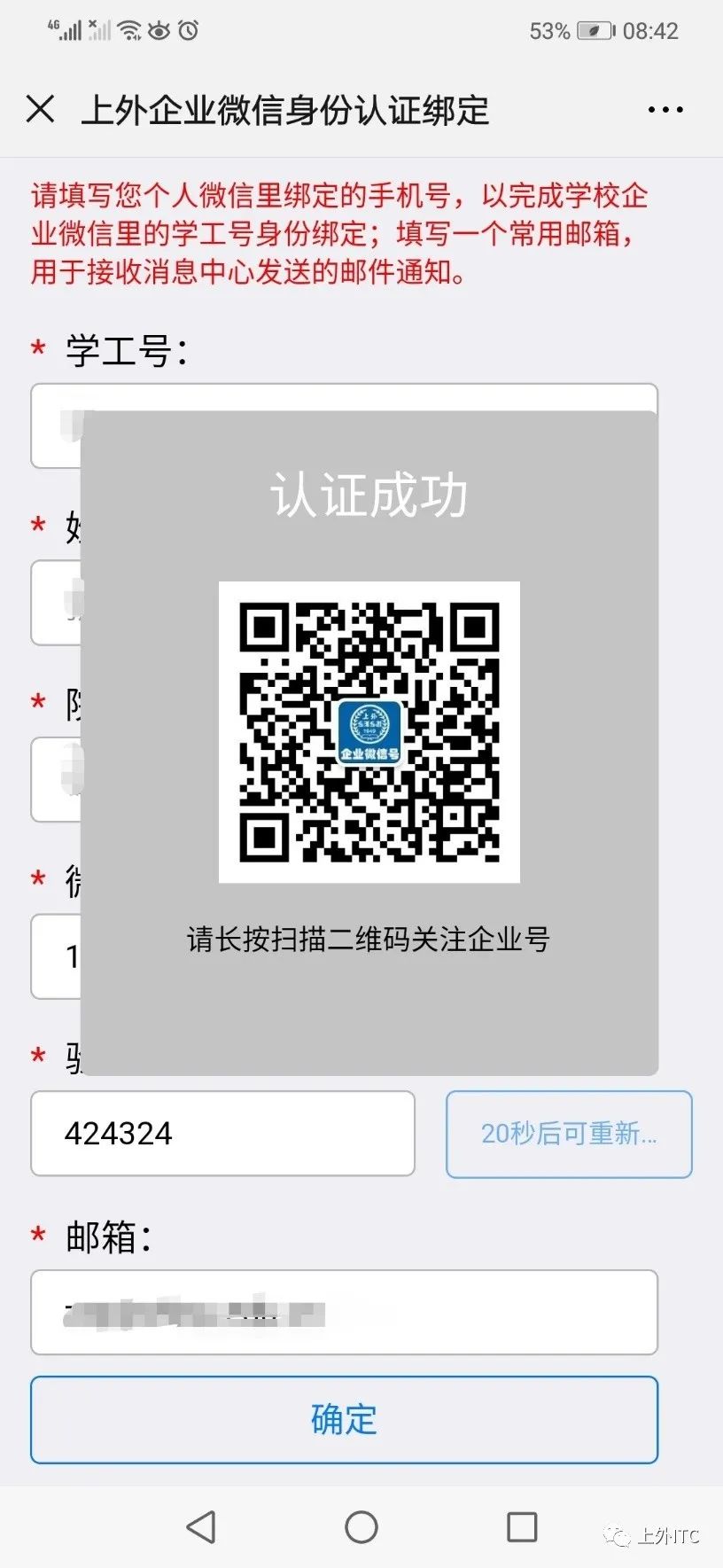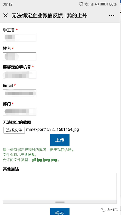 Solution 2: The current account ID has completed the identity binding operation with the current cell phone number, but recently unfollowed WeCom, please click this link http://portal.shisu.edu.cn/node/25083, login in to the chart via the Unified Identity Authentication, and fill in the correct information, screenshot and description of the problem and submit, we will notify you by email after processing.