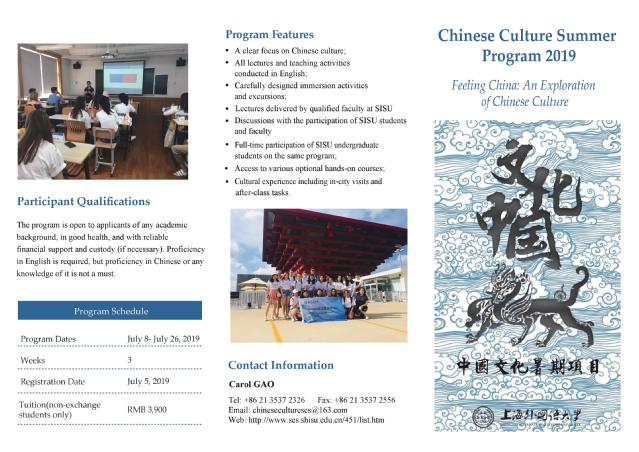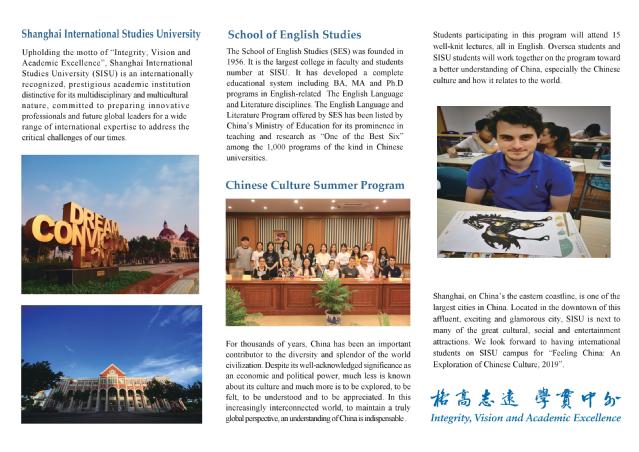Students participating in this program will attend 15 well-knit lectures, all in English. Oversea students and SISU students will work together on the program toward a better understanding of China, especially the Chinese culture and how it relates to the world.