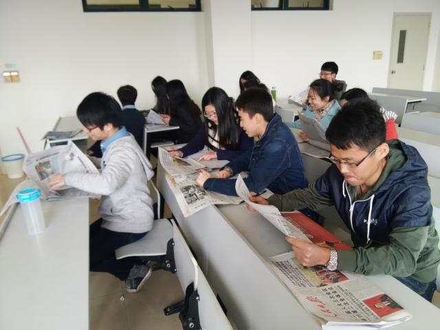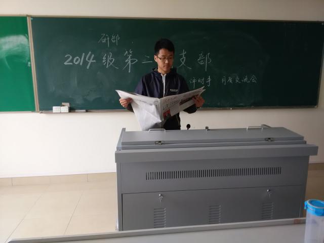 326日下午3点,第四教学楼的315教室传出热烈的讨论声,研究生部2014级第二党支部每月例行一次的“读报纸评时事”活动在这里举行。