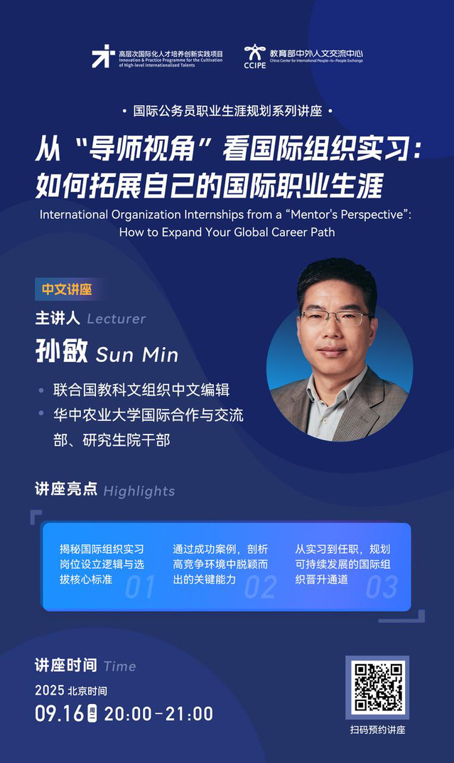 国际公务员职业生涯规划讲座 | 从“导师视角”看国际组织实习:如何拓展自己的国际组织生涯(2025年9月16日20:00-21:00,主讲人:孙敏)