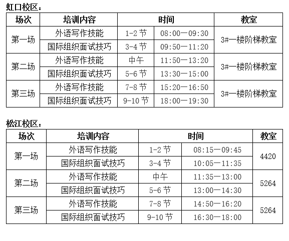2020年10月29日(周四),原定两校区共进行四场,根据报名情况现更改为六场,每场分为两个培训内容,申请人可任选一个校区,选择合适的时间参加。