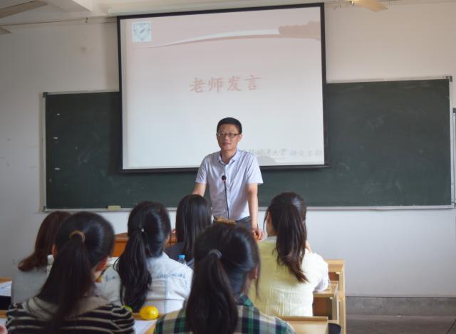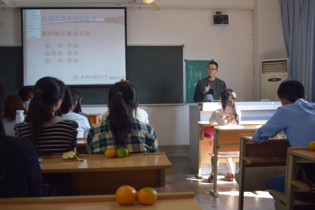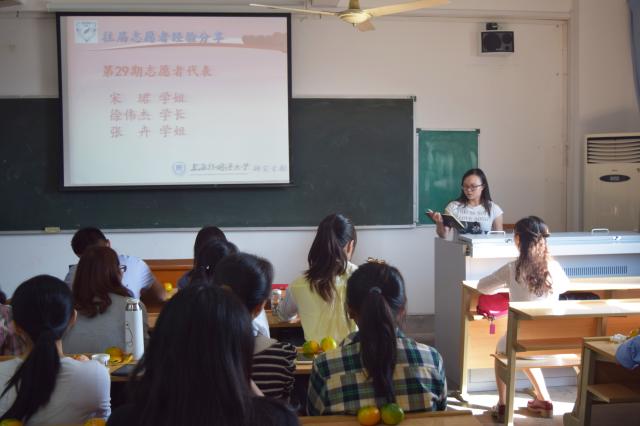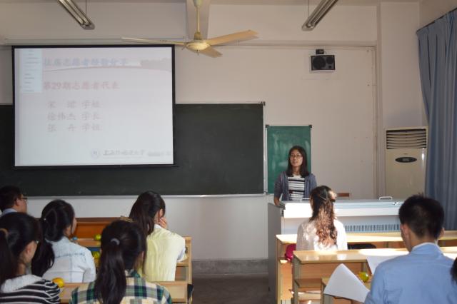 随后,盛老师从“爱心助学”活动的背景与影响、如何成为一名优秀的志愿者及该活动与研会实践部的渊源这三方面向到场志愿者进行了说明,并表达了对新一期“爱心助学”活动的热烈期待和对志愿者的殷切希望。他首先提到,本期“爱心助学”的受助对象与前一期相同,都是家庭困难、品学兼优的学生。志愿者们应秉承研究生志愿者一贯的优良作风,在做好助学衔接工作的基础上,发挥专长,传递正能量。接着,盛老师又指出,高度的责任心是优秀志愿者的必备条件。他对从众多申请者中选拔出来的40名新一期志愿者说道:“我们应该珍惜机会,不忘初心,因为我们是一座桥梁,可以帮助孩子们收获力量、友情和一颗感恩的心。” 最后,他还强调了研会实践部在“爱心助学”志愿活动中扮演了组织、协调、监督和服务角色,期待实践部能和志愿者同心协力,顺利地完成本期助学活动。