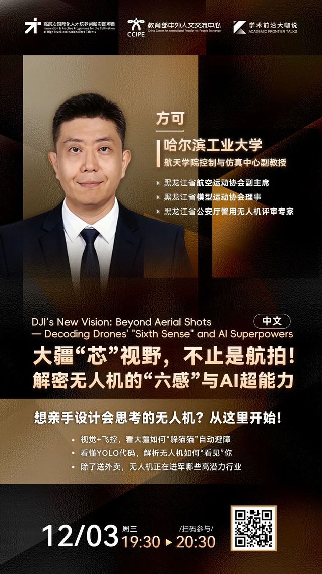 学术前沿大咖说 | 大疆“芯”视野,不止是航拍!解密无人机的“六感”与AI超能力(2025年12月3日 19:30-20:30,主讲人:方可)