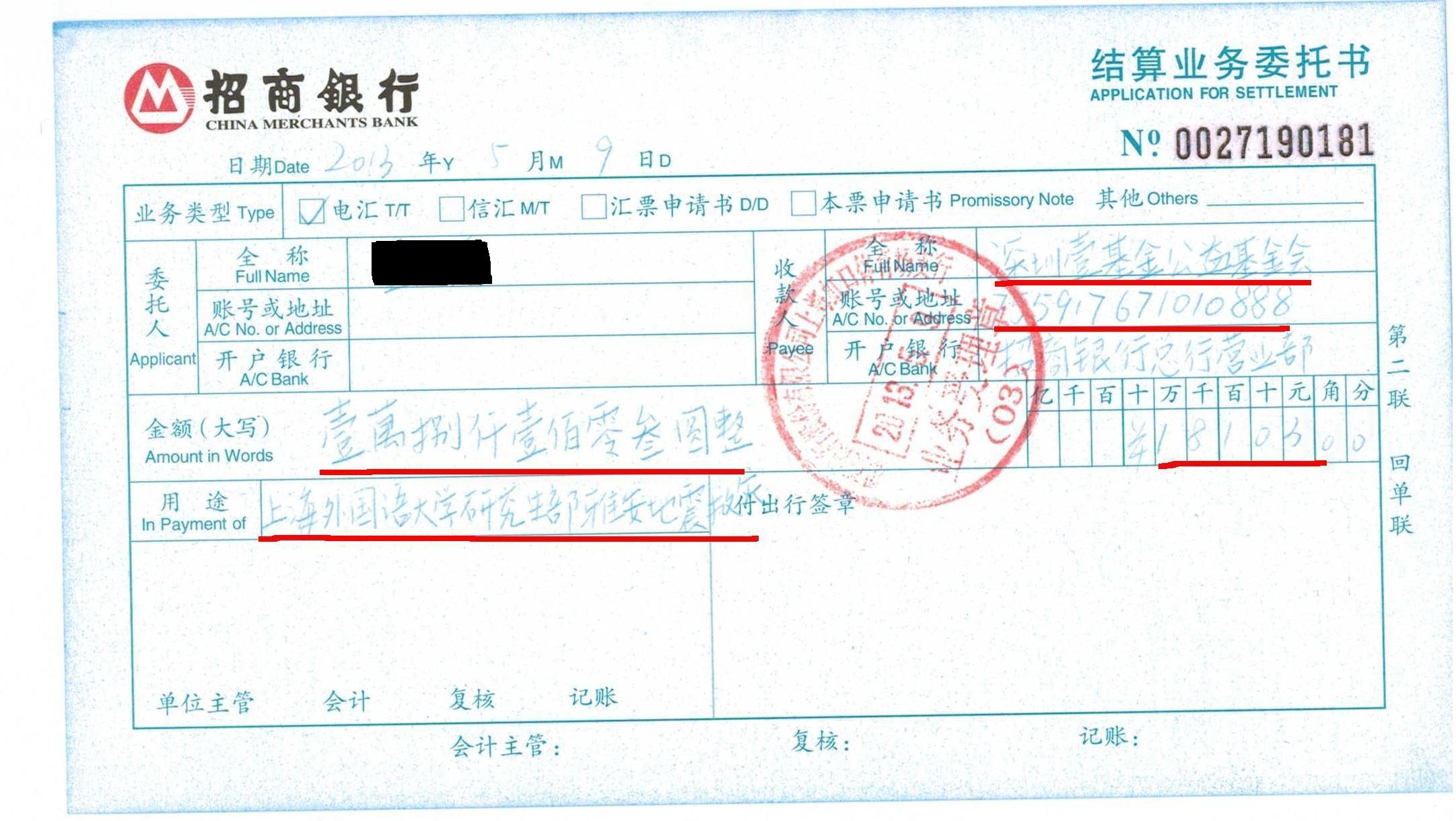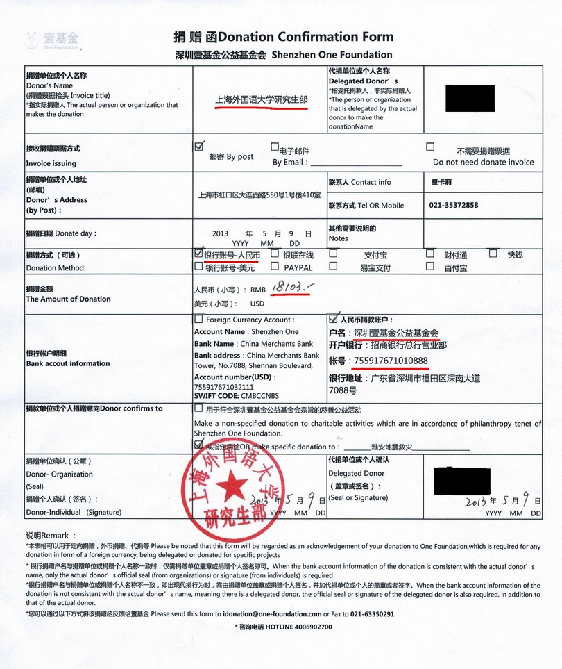 2013年5月9日,上海外国语大学研究生部通过招商银行以电汇的方式将上述善款悉数汇给了深圳壹基金公益基金会官方网站公布的招商银行账号(755917671010888),为使广大研究生同学及时了解善款的使用情况,现将汇款凭证与捐赠函附上,欢迎大家监督。