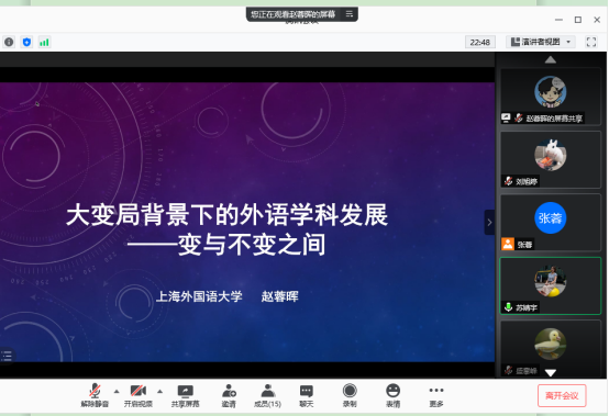 支部书记赵蓉晖同志认真研读学习了十九届五中全会会议精神后,在全国第五轮学科评估大背景下作了题为《大变局背景下的外语学科发展——变与不变之间》的报告。