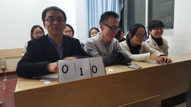 在主持人宣布竞赛规则后,活动正式开始。一个个问题抛向各位党员同志,如“三严三实”的内容和开展范围、加强和改进党的作风建设的核心问题、党的纪律处分五大原则、“四个全面”、社会主义核心价值观、“十三五”规划等。他们有的淡定自若,有的低头沉思,有的滔滔不绝,有的互相商量,在短暂的思考之后,纷纷自信地亮出自己的选项牌。主持人宣布正确答案后,既有欢快的欢呼声,又有轻轻的叹息声,整个竞赛过程不乏各组同学连连不断的爽朗笑声和彼此鼓励的加油声。从最开始的选择题到最后富有挑战性的简答题,各位党员和入党积极分子参与热情日益高涨,充分体现了各位同学在前期自学理论过程中打下的扎实基础。一个多小时的知识竞赛活动很快告一段落,最后,第四组以620分的高分荣获一等奖。临别之际,各位党员和入党积极分子与鲜艳的党旗合影留念。
