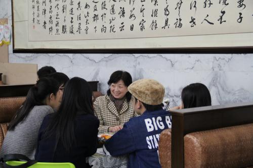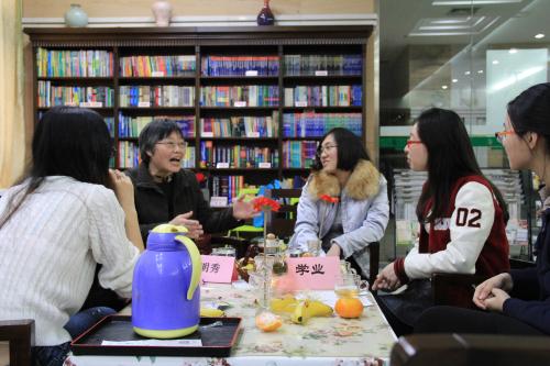 活动中,大家围桌而坐,把盏品茗,谈笑风生,其乐融融。对于同学们提出的各种疑问和困惑,老师们总是知无不言,言无不尽。前高翻学院院长姜如芳老师在给同学们做就业指导时说道:“你们毕业后如果愿意的话,完全可以出去闯一闯,即使最后没有成功,也不会损失什么。”听完这句话后,围坐在姜老师身边的同学们都不约而同地点起头来。而当一位英语专业的男生谈起自己出国读博的顾虑时,姜老师又耐心地就这位同学的问题作了具体的分析和解答。她以自己多年的工作经历中所遇到的真实事件给大家举例,开通的思想,幽默的谈吐吸引了众多同学的驻足聆听,轻而易举地赢得了同学们的“芳心”。日本文化经济学院的吴云珠老师和王萍老师人气颇高,活动一开始身边就围了一群日语专业的同学。同学们七嘴八舌地讨论着,老师们忙着回答同学们抛出的一个又一个问题,也顾不上喝水。国教学院的史惠莉老师和西方语系的王小英老师这桌的讨论气氛则十分热烈,不时地传出老师们爽朗的笑声。几位同学在语言学习过程中遇到了困难,史惠莉老师说:“看书或期刊时,遇到了看不懂的,可以先跳过去,先把觉得有意思的记下来。而记了忘,忘了再记的过程至少会反复三到七次,”王小英老师意味深长地朝同学们点了点头。说完看书的方法,热情的王小英老师甚至让同学们拿出课本,以希腊语为例教同学们如何正确发音。老师们和蔼可亲,不仅专业知识过硬,生活经验也十分丰富。俄语系的高明秀老师,刚给一位同学解答完专业上的疑惑,又和另外三四位同学聊起了婚恋与家庭。高老师关切地对身边的同学们说:“相处时一定要细细了解对方,记住人品才是最重要的呀!”体育教学部的庄孜老师和西方语系的缪建华老师主要侧重于帮助同学们解除关于婚恋问题的困惑。活动中,陆陆续续有好几位同学单独来找老师们谈心,她们也始终笑容可掬地看着并耐心地倾听每一位前来倾诉的同学。而来找林为芬,刘喜屏等老师咨询的同学大多愿意与老师一对一单独交谈,后来的同学也十分耐心地在一旁静静地等待与老师交流的机会。老师们用她们那慈爱的眼睛关切地注视着同学们,像对待自己的孩子一般,与他们恳切长谈。同学们也在老师们的柔柔絮语声中,打开心扉,倾吐出内心的困惑与迷茫。