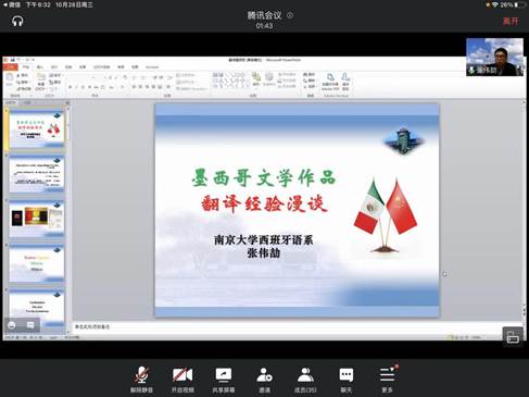 【西班牙语专场】10月26日、28日,西班牙语专场讲座在线上举行,邀请自由职业同传译员韩硕、南京大学西班牙语系系主任张伟劼老师分别担任主讲嘉宾,由程喆老师主持。张老师的分享主题为“墨西哥文学作品翻译经验”,他介绍了自己对纳华语地名的处理经验,并总结了墨西哥西语表达的一些特点,以及西班牙殖民者对于墨西哥民族自我认识、语言使用习惯的影响,拓宽了西语专业同学们的思路。韩译员以“永远保持进取心”为主题,着眼实践领域,通过分享自己的求学经历和自由译者从业历程,为西语专业日常训练提出实用建议,并勉励大家保持进取心,着眼更广阔的世界,让同学们获益颇丰。