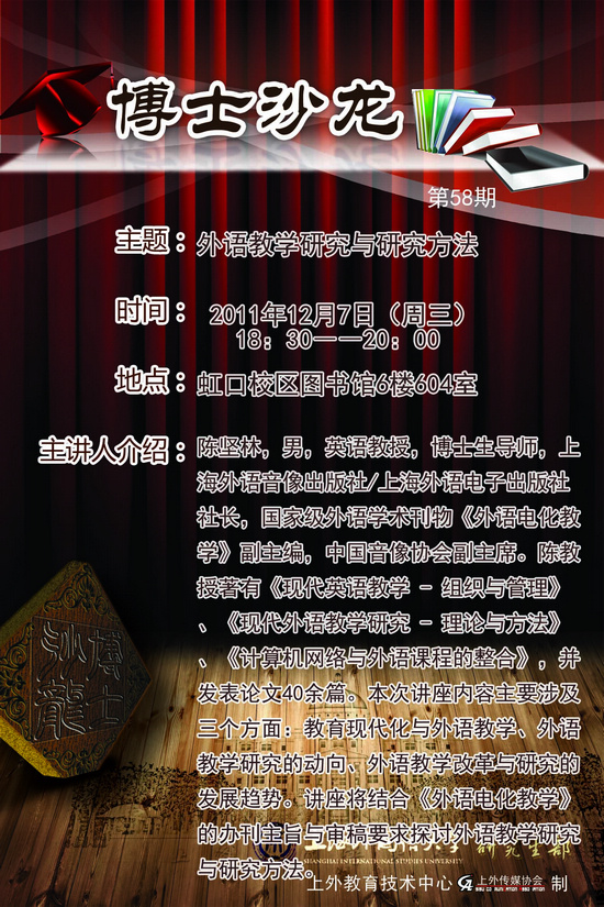 主讲人简介:陈坚林,男,英语教授,博士生导师,上海外语音像出版社/上海外语电子出版社社长,国家级外语学术刊物《外语电化教学》副主编,中国音像协会副主席。陈坚林教授长期从事外语教学理论与实践研究,主要研究领域有:外语教学的组织与管理、课程设置、大纲设计、教师培训、课堂教学、教材编写、外语教学研究的理论与方法、计算机网络与外语教学等。陈教授著有《现代英语教学 - 组织与管理》、《现代外语教学研究 - 理论与方法》、《计算机网络与外语课程的整合》、《信息技术与外语教学研究》,并发表论文40余篇。
