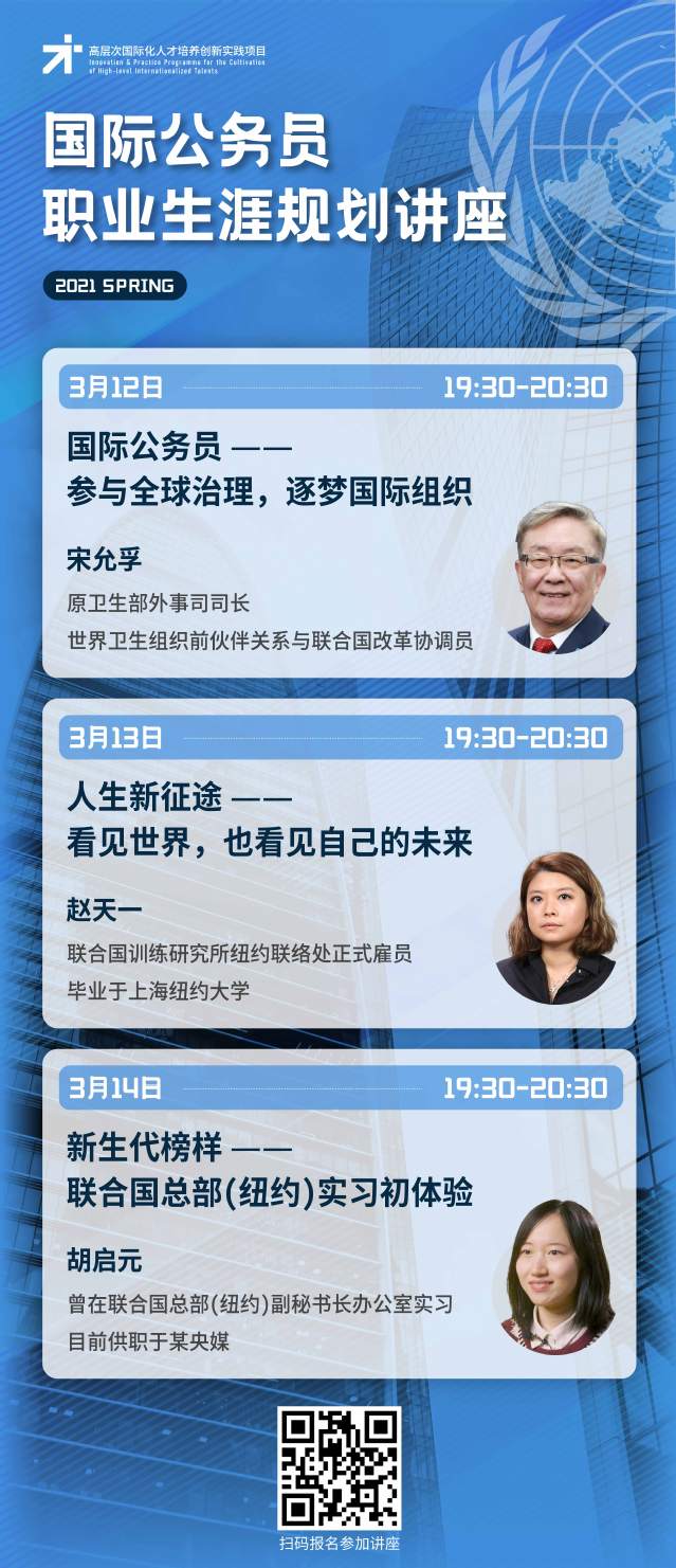 2021年春季学期国际公务员职业生涯规划系列讲座已经开放报名,三位主讲嘉宾将围绕国际组织的实习与工作,分享自己的经历和体会。如果你也想了解全球治理的相关信息,对申请国际组织实习满怀向往,一定不要错过这些精彩的“干货”分享!