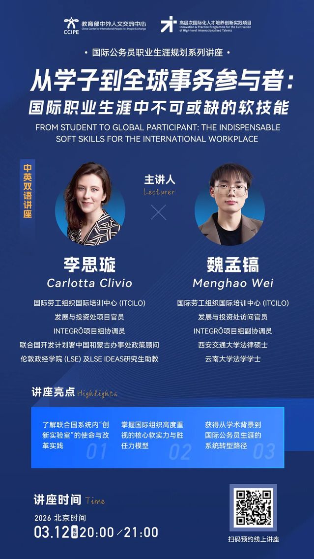 国际公务员职业生涯规划讲座 | 从学子到全球事务参与者:国际职业生涯中不可缺少的软技能(2026年3月12日20:00-21:00,主讲人:李思璇、魏孟镐)