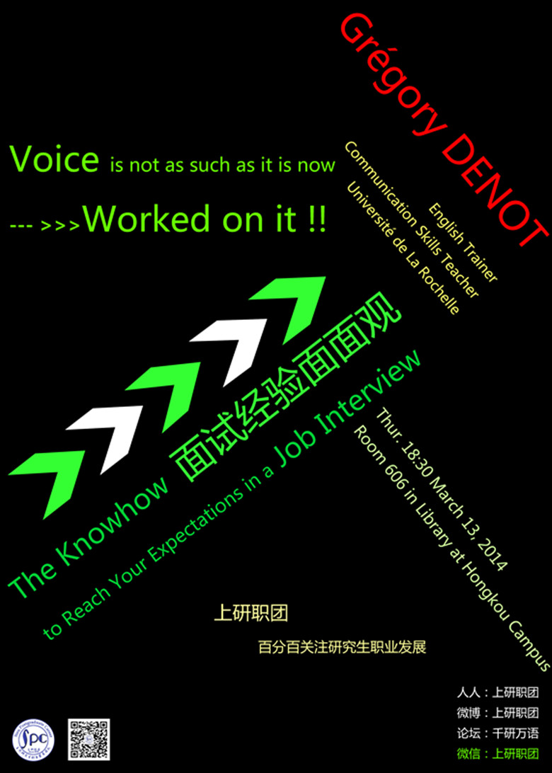 时间:2014年3月13日 周四晚 18:30 地点:图书馆606室 主讲人:Gregory Denot English trainer, Commnication Skills Teacher 主题: The Know How To Reach Your Expectations In a Job Interview (全英文讲座)