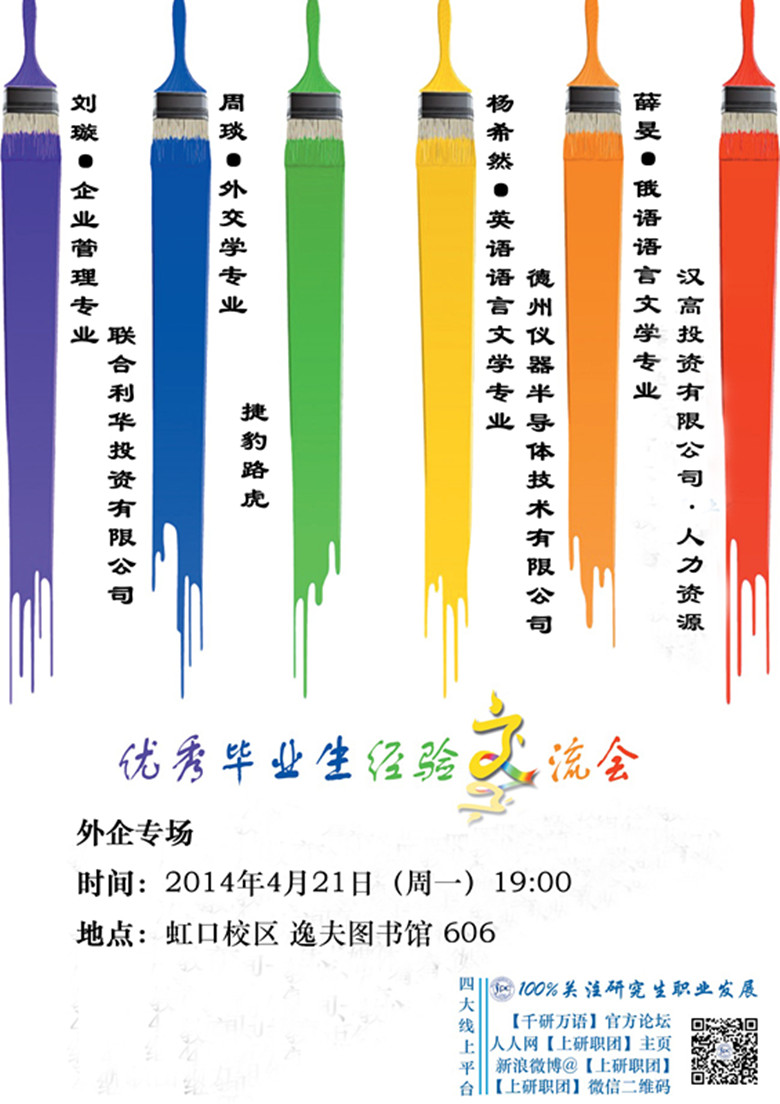 【第92期】 时间:2014年4月21日(周一)19:00 地点:虹口校区图书馆606室 毕业生嘉宾介绍: 刘 璇 企业管理专业 签约单位:联合利华股份有限公司 周 琰 外交学专业 签约单位:捷豹陆虎有限公司 杨希然 英语语言文学专业 签约单位:德州仪器半导体技术有限公司 薛 旻 俄语语言文学专业 签约单位:汉高(中国)投资有限公司 上研职团---100%关注研究生职业发展 04月21日 2014届优秀毕业生经验交流会----外企专场