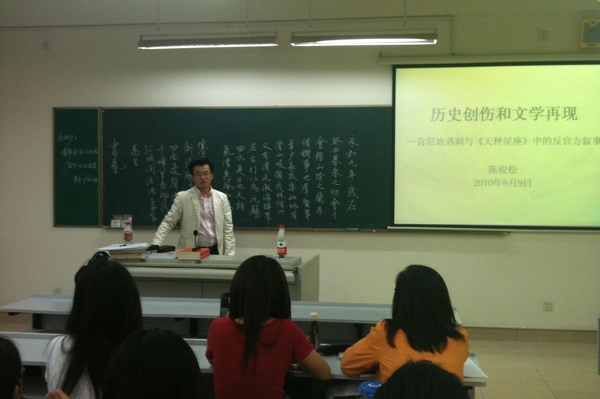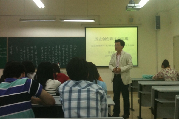 文学可以模仿,但文学不是事实本身;历史不可再现,而文学是研究历史的注脚。陈博士从细微处入手,深入浅出地解释了历史创伤和文学再现之间的联系。陈博士以其深厚的文学修养、风趣的语言魅力将讲座一步步推向高潮。讲座临近尾声时,听众意犹未尽,与陈博士交流论文撰写、出国留学等大家关心的话题。此次学术讲座在和谐、活跃的气氛中圆满结束。此次讲座的成功举办带动了同学们的学术热忱,为大家提供了与众不同的视角和思维方式,有助于提高大家的科研能力及理论修养,得到了同学们的普遍欢迎。(文/图 学术部芮晓慧)