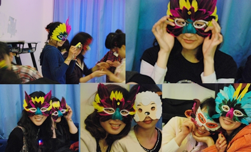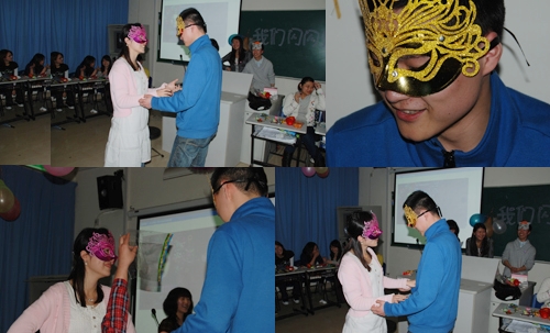 化妆面具是当晚Party的一个亮点,到场的每位同学都有机会领到。帅哥美女们戴上这些风格各异的面具后争相合影留念,现场俨然有了一点化妆舞会的气氛。当晚主持人还准备了两个造型极为别致的面具,预留给神秘嘉宾1号男和25号女。序号以大家到场顺序为准,序号为125的这两位“幸运同学”将很荣幸地为众同学奉上影片《罗密欧与朱丽叶》的经典片段。后来两人不孚众望进行了极生动的演绎,掀起了当晚一个小高潮。