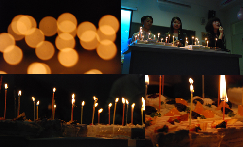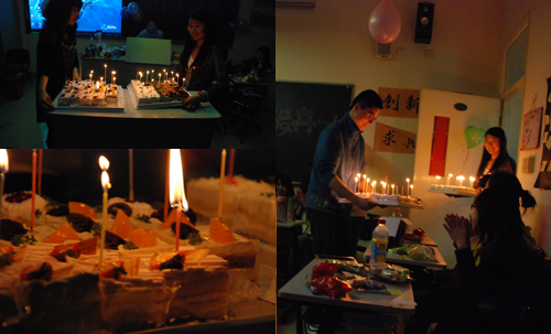 为了使同学们能真正敞开心扉面对面交流,班委之前一直绞尽脑汁设法营造极具现场效果的温情气氛。几次讨论后,最终决定用最最浪漫的烛光、最最温馨的蛋糕来呈现。游戏环节接近尾声时,张昕和连晋妃悄悄走出教室去准备蛋糕和蜡烛。