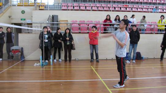 在上周的小组赛中,我部战胜了法语系,而本周的对手英语系则一直被认为是我们的劲敌。今天的比赛共五场,采用五场三胜制。在每场比赛中,选手又要打满三局,这对于我们这群松江校区的“老大哥老大姐们”在体力和耐力上都是一大考验。前三场比赛结束后,我们研究生队以1:2的比分暂时落后。第四场由英语专业的王子磊同学出战,这一场比赛打得尤其艰苦。首局不利,但王子磊同学并没有松劲,而是及时调整好了自己的心态和状态,奋起直追,第二局在落后的情况下顽强追至14平,并以16:14拿下。第三局,王子磊开场领先,在被对手追至14平之后,连下两分,最终以又一个16:14艰难地战胜了对手,将总比分扳成了2:2。由于赛前羽毛球队已经进行了周密的战术部署,派出了实力较强的一号种子成振鹏出战决胜局,轻松战胜对手,拿下了这最后一局。最终以3胜2负的战绩取胜。