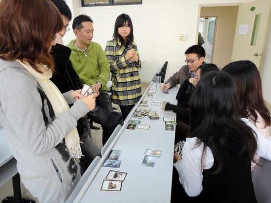 拿起了飞镖,我们文静的女生们顿时变得英姿飒爽,控力度,拼准度,靶子被同学们的飞镖技艺震掉了好几次。观众自动围成一圈,不时鼓掌叫好。再看看三国杀那边,这可是需要一定技巧的“技术活”。开赛前几天就有人在校内上转帖,“学不好数学的就不要玩三国杀”,可见三国杀的强大魅力。作为本次趣味运动会的新增项目,三国杀将一群有共同喜好的同学聚到了一起,大家集思广益,尝试了多种不同的玩法。即使是素不相识的同学也迅速组建起团队,齐心协力,不亦乐乎。来自韩语专业的舒欣如和郑青青同学拿到了三国杀的第三名,郑青青大叹趣味运动会让她摆脱online版三国杀,认识了超多的厉害桌友。