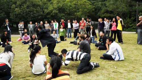 我们MTI(翻译硕士)班比较特殊,笔译和口译分开授课,其中笔译又分成A、B班,因此很多同学彼此不太熟悉。这次班级活动正好为大家提供了一次相互认识的机会,构建了交流的平台。考虑到大家学业繁忙、时间紧张,我们决定采用一套经济省时的方案――在鲁迅公园开展户外游戏。