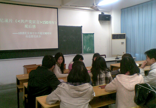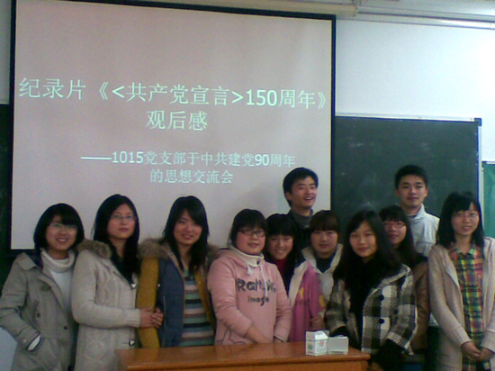 2011年3月23日下午,10级15支部全体党员和入党积极分子共13人在虹口校区1号教学楼504教室观看了纪录片《〈共产党宣言〉150周年》,并进行了关于中共建党90周年的思想交流会,会议由10级第15党支部书记董洁琼主持。