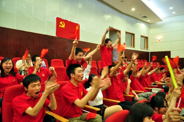 经过初赛的角逐,2010级共六个党支部进入了当天的决赛,他们分别是2支部、3支部、4支部、8支部、12支部和17支部。活动还没开始,场下各支部啦啦队之间的“竞赛”就已如火如荼:只见大家纷纷喊着支部口号,有的支部还穿上统一的队服,为本支部的参赛代表加油助威,这气势不是运动会却胜似运动会。