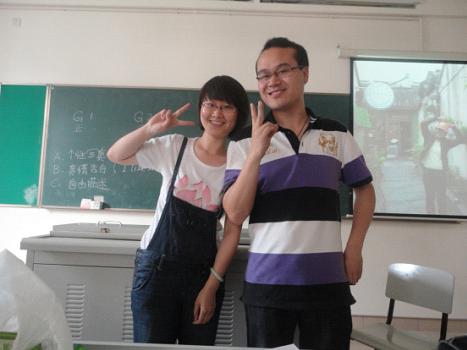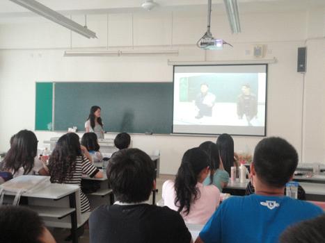 之后,八位主持人精彩策划的四组活动终于依次揭开神秘面纱。首先亮相的是由肖惠方和郑慧娟同学主持的“猜猜我是谁”,游戏规则要求参与者用三句英文描述一位同学让大家猜,结果只待听完一句,大家便纷纷猜出谜底。整场活动的背景PPT是三班全体同学的靓照集锦。细心的主持人在活动前夜到每位同学的人人网主页搜集照片。