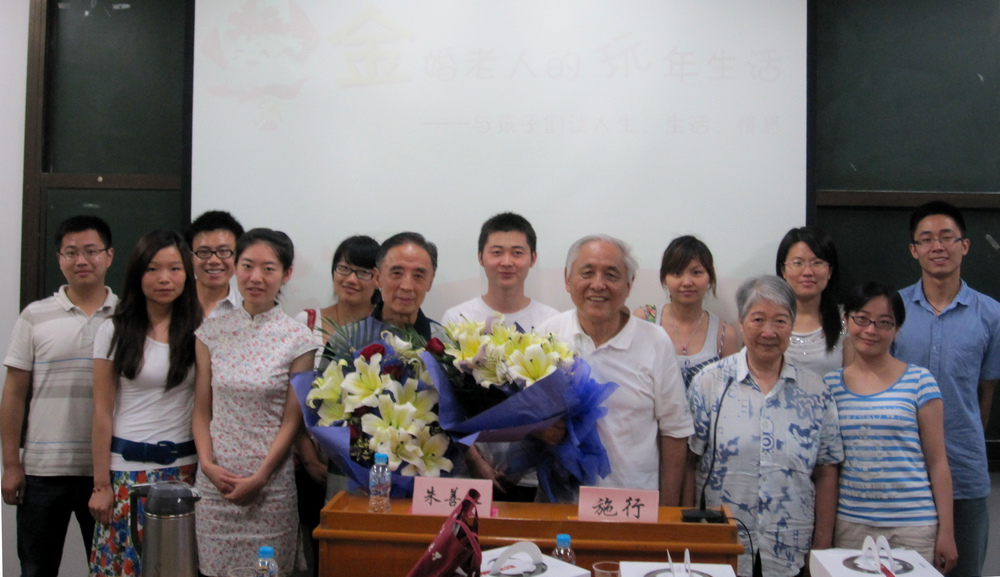 2011年7月2日下午3点50分,虽然室外烈日炎炎,但是虹口校区一号教学楼202教室里座无虚席。研究生同学们在此齐聚一堂,聆听上海外国语大学的两位退休老师施行教授和朱善长教授讲述他们的“玩”年生活,分享他们的人生和情感经历。