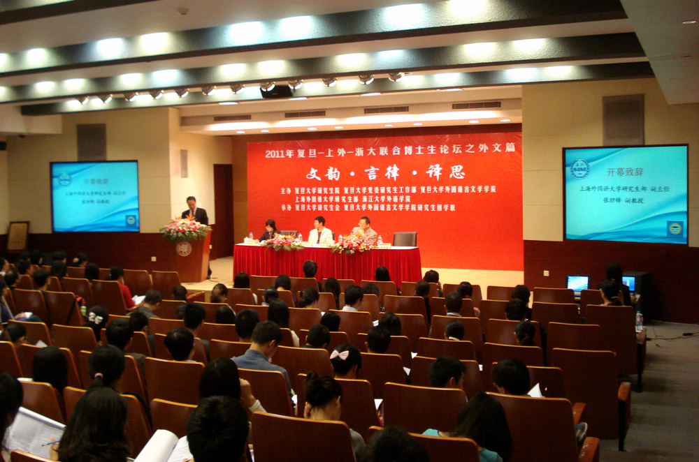 2011年10月16日,由复旦大学研究生院、党委研究生工作部、外国语言文学学院、上海外国语大学研究生部、浙江大学外语学院主办,复旦大学研究生会、外国语言文学学院研究生团学联承办的2011年“复旦-上外-浙大联合博士生论坛之外文篇”在复旦大学光华楼成功举行。本届论坛以“文韵·言律·译思”为主题,旨在搭建复旦、上外和浙大三校的学术交流桥梁、为各校硕、博士提供施展才华、求学创新的舞台,加强三校的学术交流及文化传播。我校研究生部副主任黄震宇、张绍铎老师、培养办主任徐秋园老师、学管办副主任周莉老师作为嘉宾出席了此次论坛的开幕式。