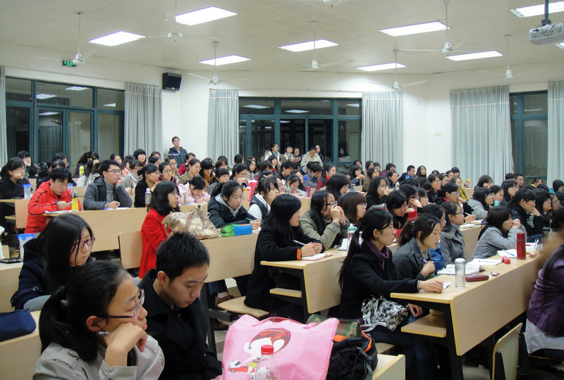 如此优秀的主讲人,自然是不会缺乏吸引力的,同时也激起了同学们对学术与科研的热情。在17:00点之前便不断的有同学陆陆续续的赶来,快到18:00点时,能容纳130人的教室已座无虚席,有的同学只能是坐在地上或站着听讲,更有同学直接倚着后门的窗口聆听学术的召唤。