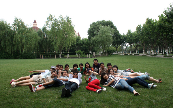 松江校区,美丽的土地,有英式花园、有小桥流水、有小树林、还有一片片绿意盎然的草坪。在学校正门一侧的草地上,热心的张祎瑛同学给大家提出了一个富有创意的集体造型:所有人平躺在草坪上,围成一个圈,整体造型仿若一个光芒四射的太阳。这个创新提议马上得到了同学们的一致赞许。于是,大家迅速各就各位。为了集体效果,身着干净漂亮衣服的女生们毫不犹豫地躺在草地上,摆出美丽的造型。接着,摄影师徐添兴同学将单反相机用三脚架支起架在树枝上。“咔咔咔咔”四连拍,记下了大家“幸福地像花儿一样”的笑脸。拍摄之中,不知哪位同学突发奇想,唱了句“二零一二年,那又是一个夏天,有一个班级在草坪上围成了一个圈儿……” 顿时,一朵朵“幸福的花儿”又灿烂地大笑开来。