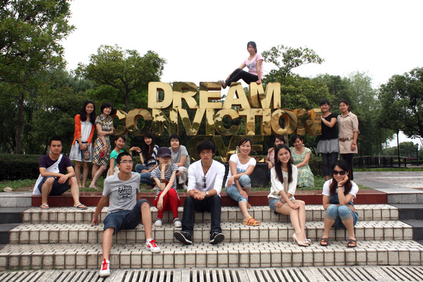 在大家集思广益下,一系列新颖多姿的整体造型一一出炉:圆形、V型、等边三角形、波浪形、心形等等;然后摄影师徐添兴同学精选了几幅背景;大家发挥各自创造力,摆出各种姿势:有的扮作歪戴鸭舌帽的俏皮假小子;有的“展翅飞翔”;有的拥抱蓝天;有的扮成小丑;有些背靠背;有些心连心……风格迥异,各显风采。最后大伙儿一起在草坪上纵跳,由相机再次四连拍捕捉我们腾飞的瞬间。我们要一起飞得更高!校园的小河、石阶、树林、雕像以及各个风格各异的教学楼都见证了我们美丽的回忆。