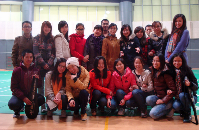 随后,大家开始热身运动。租下的三片羽毛球场地很快被占据一空,连场边的空地也被大家很好的利用了。你一拍,我一接,羽毛球场上只见白色的小球在空中炫舞。有的同学因“扣杀”成功,兴奋不已;有的则因错过了一个好球而轻声懊悔。技术颇高的贝龙震和李兆国同学精彩的单打吸引了众人的目光,大家连连惊叹叫好;羽毛球入门同学尚不娴熟的发球手法和生硬的脚步移动也让同学们忍俊不禁。随着各位运动健将渐入佳境,大家都打得热血沸腾,一个个脸上红彤彤的,洋溢着青春的气息。