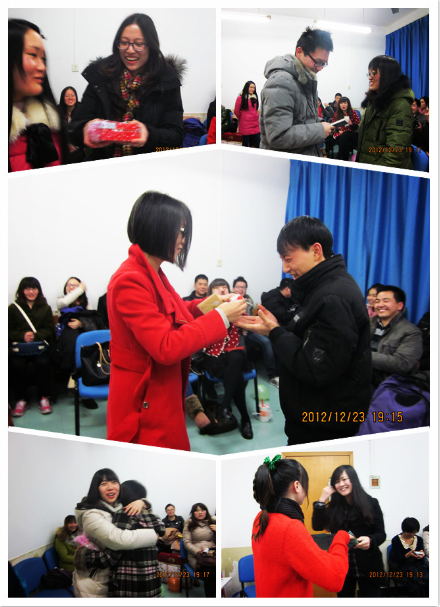 聚餐结束后,大家立刻转战到空间不大却暖暖的教室中,因为好戏才刚刚上演。晚会的第一个环节是“礼物互换”,每个同学的名字都被写在了一张小卡片上,大家依次上前抽签,抽到谁就把精心准备的小礼物送给那位同学,并送上几句温馨祝福。巧克力、温暖的手套、书、文具、亲手缝制的布娃娃,一件件礼物虽算不上多么贵重,却饱含着同学间真诚的祝福。在一份份惊喜与感动中,每位同学都开心地收到了一份礼物与祝福。