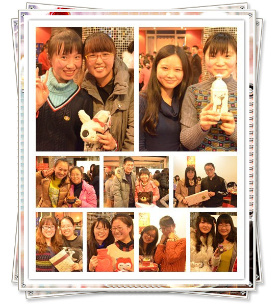 每位同学事先都精心准备了一份小礼物,大家通过抽签的方式决定要把自己的礼物送给班上的哪一位同学。在正式开始抽签前,大家就都既兴奋又期待,一方面希望把自己的真切祝福送给班上的同学,另一方面也非常渴望知道自己会收到什么样的惊喜。通过击鼓传花的方式,彭珍同学成为了首位上台抽签的同学,只见她紧闭双眼,脸上露出了幸福的笑容,选中了一张,“刘萌萌!”大家一起开心地大喊道,刘萌萌非常开心地挥了挥手,走上前来,彭珍把自己的礼物送给了刘萌萌,包装的非常精美,大家又一起喊道:“快拆礼物看一看啊!”刘萌萌把礼物拆开一看,原来是一个漂亮而又贴心的眼枕。刘萌萌拿着礼物,开心地和彭珍合影留念。就这样,大家一轮轮地赠送着自己的礼物,礼物的品种也非常丰富,有护手霜,相框,笔筒,烛台,围脖,座垫,茶杯,巧克力,暖水袋等等,林美玲同学更是自己亲手编制了两个毛线的手机套,让大家都非常感动。
