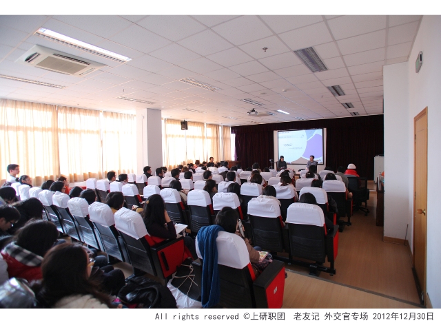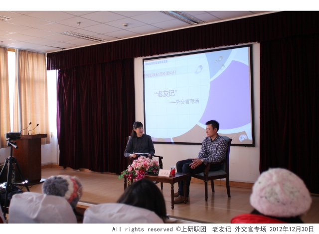 他,热爱运动,文武双全;他,曾是研会主席,上外风云人物;他,过五关斩六将,进入了外交部;他,就是上外10届博士毕业生——沈明春,现任外交部三秘,并将一如既往地在外交官道路上不断前进。2012年12月30日14:00,温馨的Central Park——图书馆606室里座无虚席,大家都在期待着一睹这位外交官的风采,聆听他与大家分享自己的外交官生涯!
