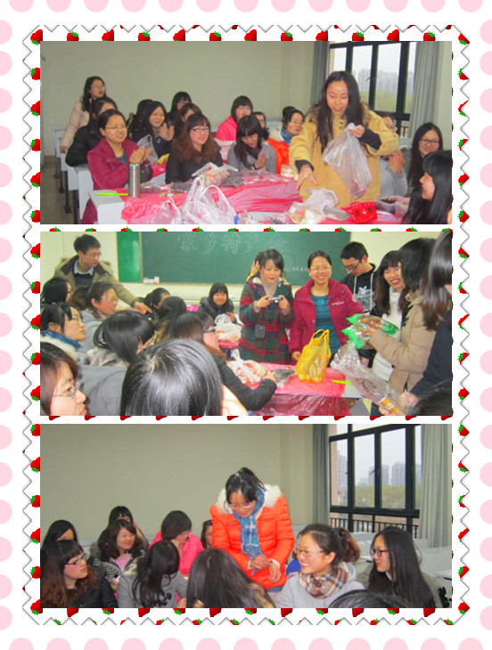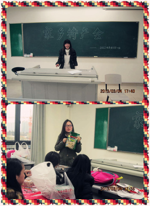 2013年3月4日晚5:30期待已久的家乡美食特产会终于在4教楼341教室“隆重”举行。此次活动分为两个流程:介绍美食和品尝美食。活动当天,同学们精心准备了自己家乡的各种特色小吃。现场美食品种繁多,有美味可口的特色肉如广汉正才红兔、南京盐水鸭、五洲牛肉、穆阳烤肉、无锡酱排骨、扬州风鹅和麻辣鹅,有鱿鱼仔、烤鱼片、凤尾鱼等各种可口海味,更有琳琅满目的美味零食包括罗江豆鸡、友军香脆椒、香辣胡豆、重庆江津玫瑰牌米花糖、磁器口陈麻花、不老林酥糖、贵州波波糖、芝麻酥糖、贡糖、阿里山瓜子、西瓜子、山东煎饼、上海杏花楼鸡仔饼、周村烧饼、麻糖、和甜果子,还有醇厚甘爽、清香扑鼻的蒿茶、益阳擂茶。所有美食制作精美,色香味形俱全,让人欲罢不能,垂涎三尺,难怪同学们个个蠢蠢欲动,没等同学一一介绍完自己的家乡美食就已经按耐不住开始一顿狂吃狂抢,现场热闹非凡,笑声不断。