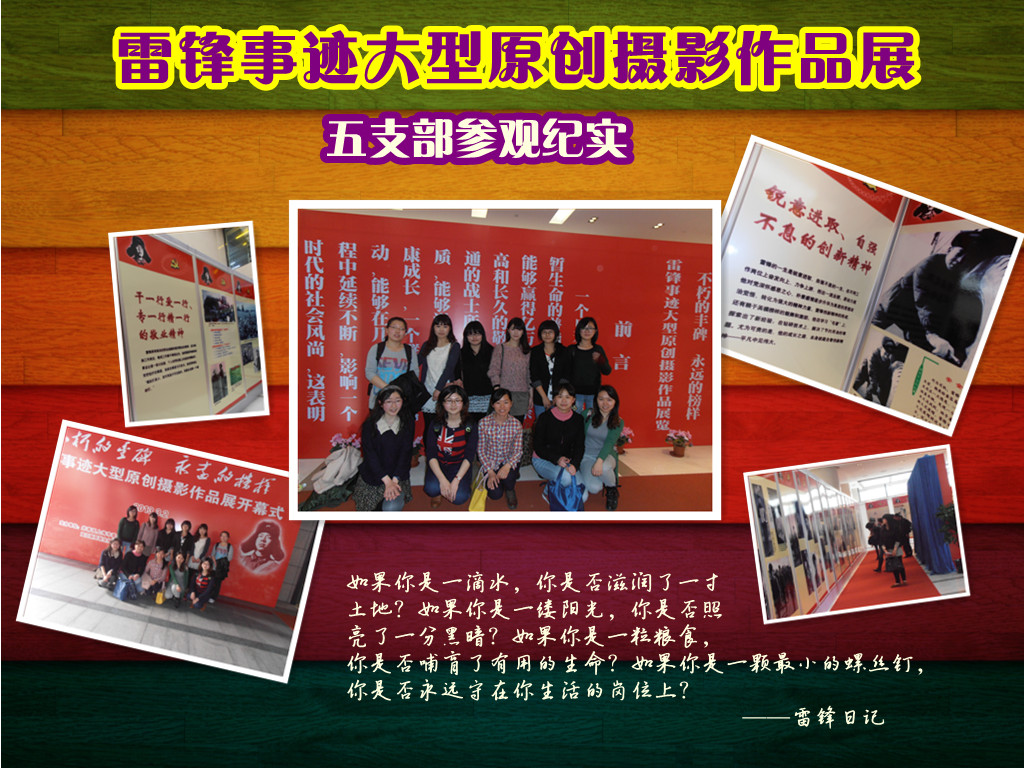 今年3月5日,是毛泽东同志亲笔题词“向雷锋同志学习”发表50周年。为了响应党的十八大“推动学雷锋活动、学习宣传道德模范常态化”的号召,2012级研究生5班党支部的党员同学和入党积极分子于3月8日前往上海市社科院社科国际创新基地参观了“不朽的丰碑,永远的榜样”雷锋事迹大型原创摄影作品展。
