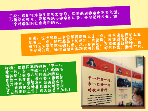 参观结束后,刘雨湉同学代表2012级5班党支部在展览留言本上写下了我们的感受。雷锋精神所体现的团结和谐、诚实守信、勤劳勇敢、文明礼让、尊老爱幼等人生命题,是雷锋时代的“特殊剧情”,更是当代社会所寻求的正能量和普适价值观。对雷锋精神的呼唤、认同乃至回归,业已成为越来越多人的共识共为。雷锋同志的那种“干一行爱一行,专一行精一行”的精神更是我们在今后工作中应该树立和贯彻的信念和态度,雷锋精神在新的时代背景下也能拥有新的内涵和意义,是充满生机和活力,常学常新的精神力量。