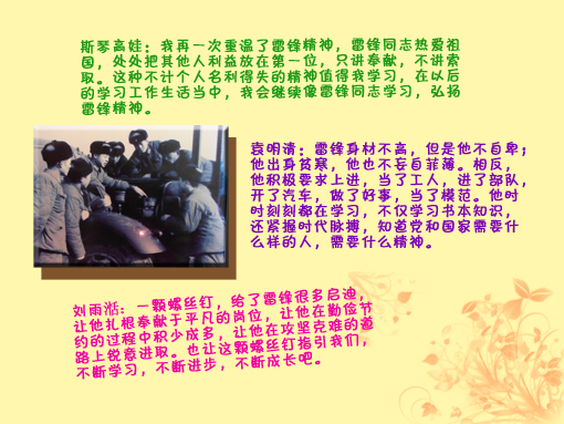 “如果你是一滴水,你是否滋润了一寸土地?如果你是一缕阳光,你是否照亮了一分黑暗?如果你是一粒粮食,你是否哺育了有用的生命?如果你是一颗最小的螺丝钉,你是否永远守在你生活的岗位上?”雷锋精神是崇高的,但并不是遥不可及的;雷锋的生命是短暂的,但他锐意进取、自强不息的精神必将延续不断,形成新时代的社会风尚!