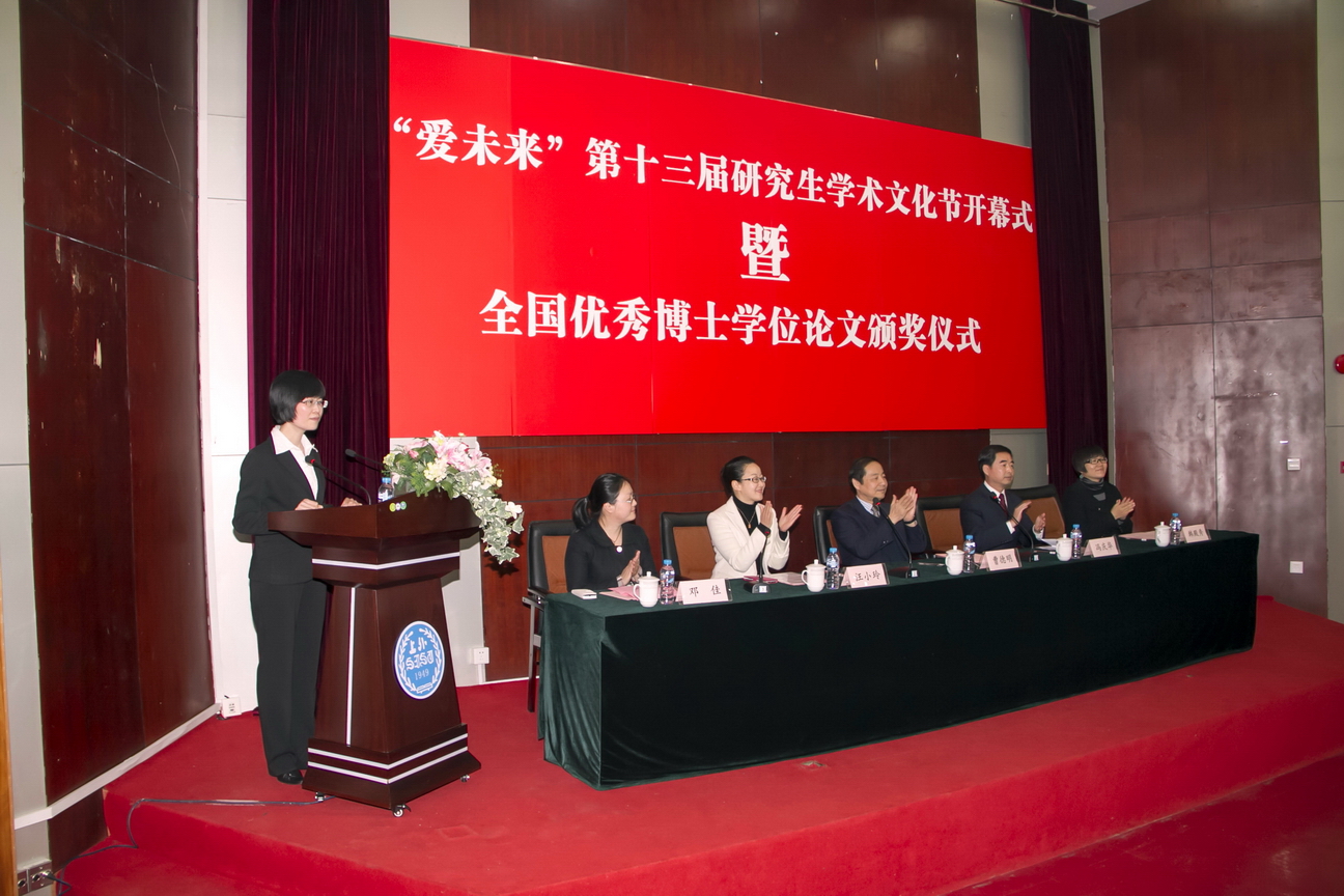 2013年4月7日下午,上海外国语大学第十三届“爱未来”研究生学术文化节开幕式暨全国优秀博士学位论文颁奖仪式在松江校区图文信息中心西厅隆重举行。上海外国语大学校长曹德明教授、副校长冯庆华教授、研究生部主任汪小玲教授、党总支书记韩殿秀老师以及校团委副书记邓佳老师在主席台就坐,开幕式暨颁奖仪式由研究生部主任汪小玲教授主持。