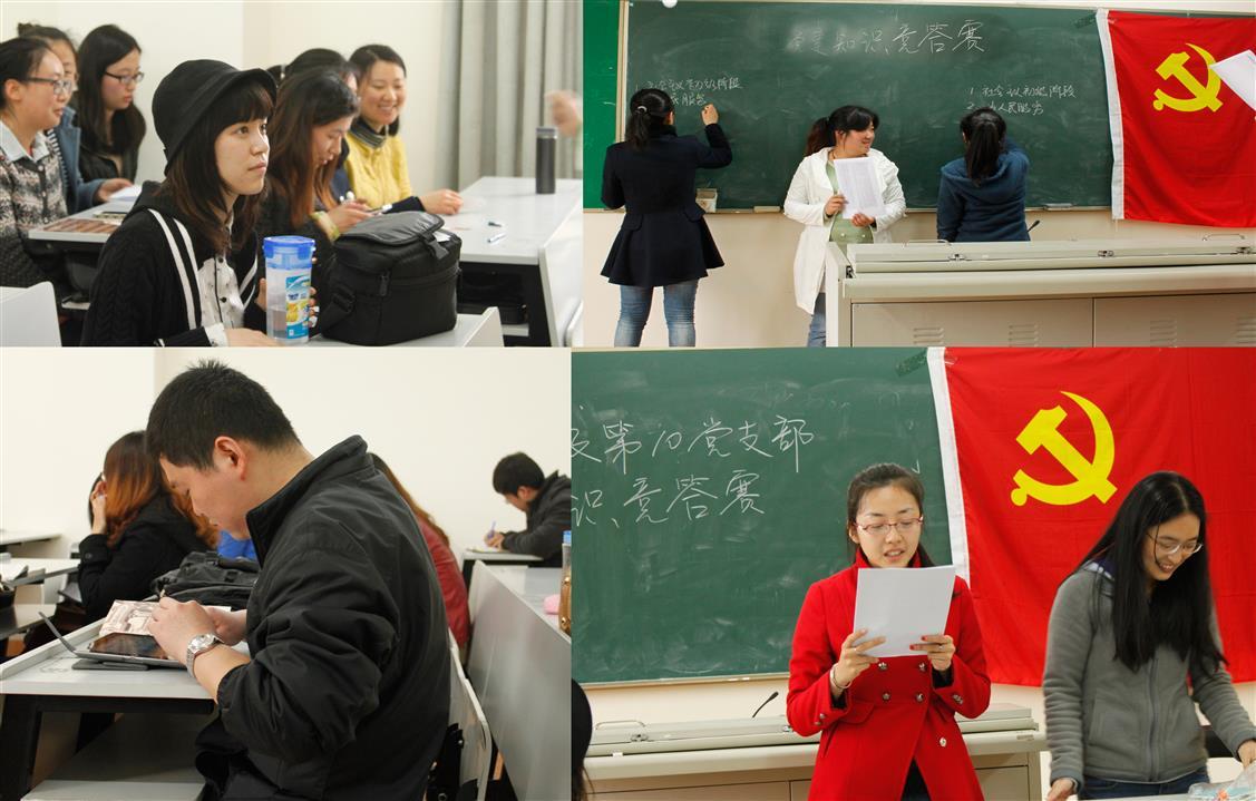 4月23日下午三点,在四教楼339教室,十班的党员同志和入党积极分子先后到达会议现场,经过一番准备,十班的支部活动——党员知识竞答就热热闹闹地开始了。支委为答对题目的同学们准备了丰富的小礼物,有卷笔刀,书签和可爱的小本子等。党员同志和入党积极分子被分为两队,活动分为两个部分,第一部分是抢答,两队分别派出了两位队员负责拍桌抢答,其他队员专门负责回答问题,哪队回答的多就获胜;第二部分是简答,每队派出一个代表上讲台在黑板上写出答案,哪队回答的又准又多则获胜。在活动的第一个环节,两队队员十分积极,踊跃回答问题,竞争势头明显,教室里不时传来欢呼声。第一个环节结束后,党员队暂时领先。第二个环节,两队都派出了实力强劲的选手,但结果积极分子队因为回答的不够准确而失去扳回一局的机会。活动的结果是党员队胜利。此次十班支部活动在一片欢乐和谐的笑声中结束,通过此次的活动,十班同学的心又一次紧密地贴在了一起,并增强了十班党支部内部的凝聚力和向心力。