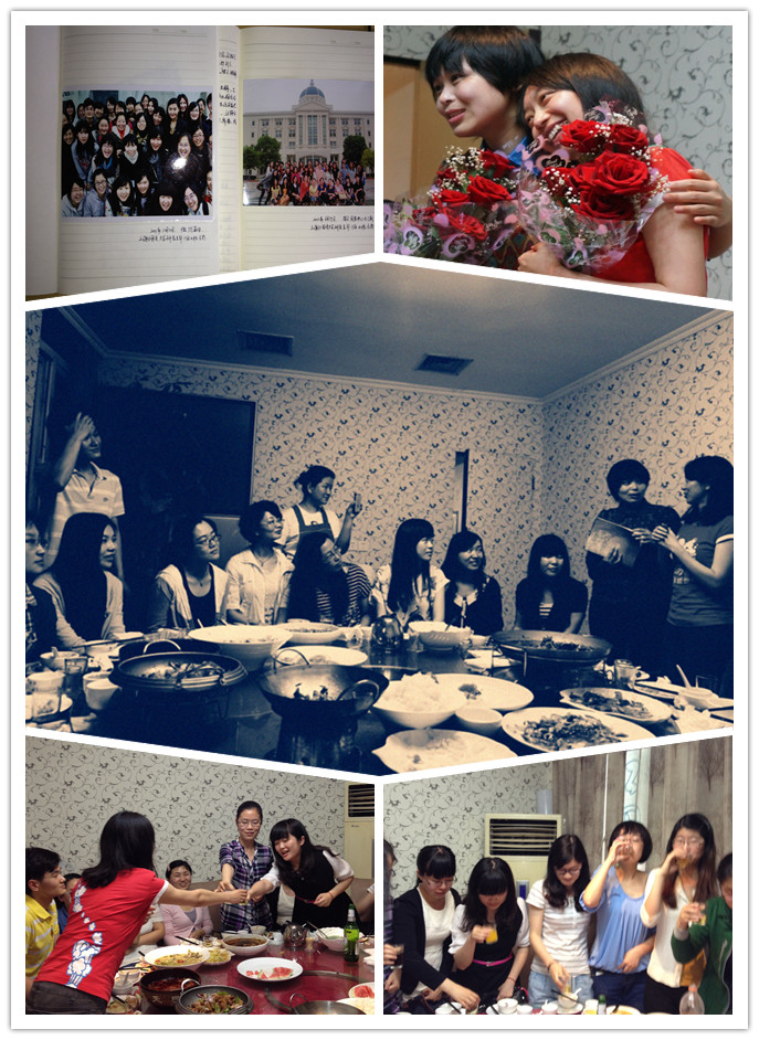 在一片欢声笑语中,菜也慢慢地上桌了,大家边吃边聊,不亦乐乎。话题最初围绕大家密切关注的实习、论文、就业等展开。大部分同学都在忙着自己的实习和毕业论文,对于康康和蔡心不但提前完成了毕业论文,将比我们早半年拿到学位证书,而且工作也有了着落,表达了艳羡之意。同学们感叹人和人的差别咋那么大,嗟叹琢磨论文的苦恼,但这些比较“闹心”的话题并没有持续多久,大家就把注意力转移到美食、减肥和漂亮衣服上面,同时互相开起了玩笑。不得不佩服大家的话题转移能力,思维跳跃跨度之大。一轮觥筹交错后,我们一起举杯祝福康康蔡心提前毕业,一起致我们不朽的青春,一起祝福大家的未来。