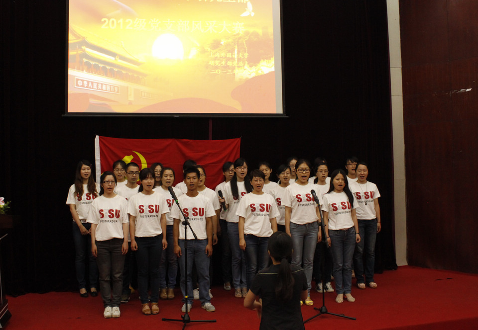 为进一步加强基层党支部建设,加强支部凝聚力和感召力,强化集体合力和创造力,研究生部党总支于2012年8月新生未入校时,就以支部为单位,将所有研究生新生纳入了网上党组织,以集体的关爱和交流欢迎每一位研究生党员和研究生同学。经过一年的支部建设,他们走过了:新生党员重温入党誓词追问曾经的梦想、支部集体学习紧跟时代步伐、党员自评互评牢记党员身份,在一个学年结束之际,为促进学生党支部的互动交流,分享支部建设的成功经验,研究生部党总支精心策划了2012级支部风采展示大赛。来自虹口和松江两校区的20个2012级研究生党支部经过近一个月的筹备,于6月21日下午在图文西厅为我们送上了一场质朴鲜活的支部风采展示大赛。校党委组织部副部长施海倩老师、研究生部党总支书记韩殿秀老师、副书记杨雪莲老师、研究生部学生管理办公室主任夏卡莉老师及所有辅导员老师出席了此次活动。
