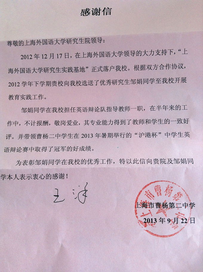 2013年10月10日,研究生部收到了一封来自上海市曹杨二中的感谢信。信中曹杨二中校长对上外研究生部给予该校的大力支持深表感谢,同时表扬了被选送至该校指导英语辩论队的2011级英语语言文学专业邹娟同学。