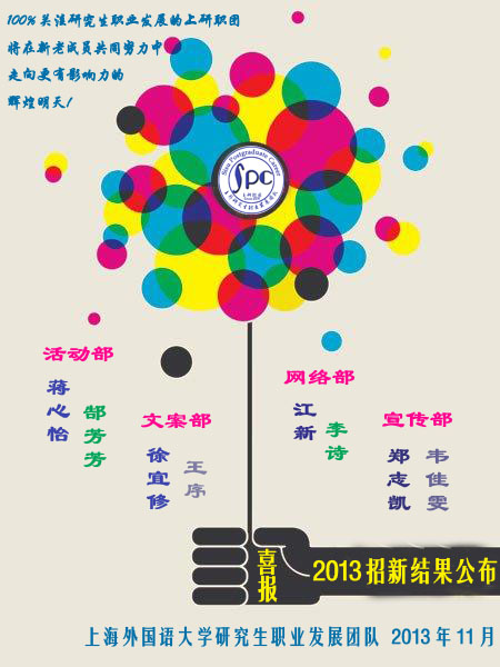 经过简历筛选、电话面试、单独面试、小组面试后,2013级上研职团新成员选拔工作现已结束。详细名单请见附图。