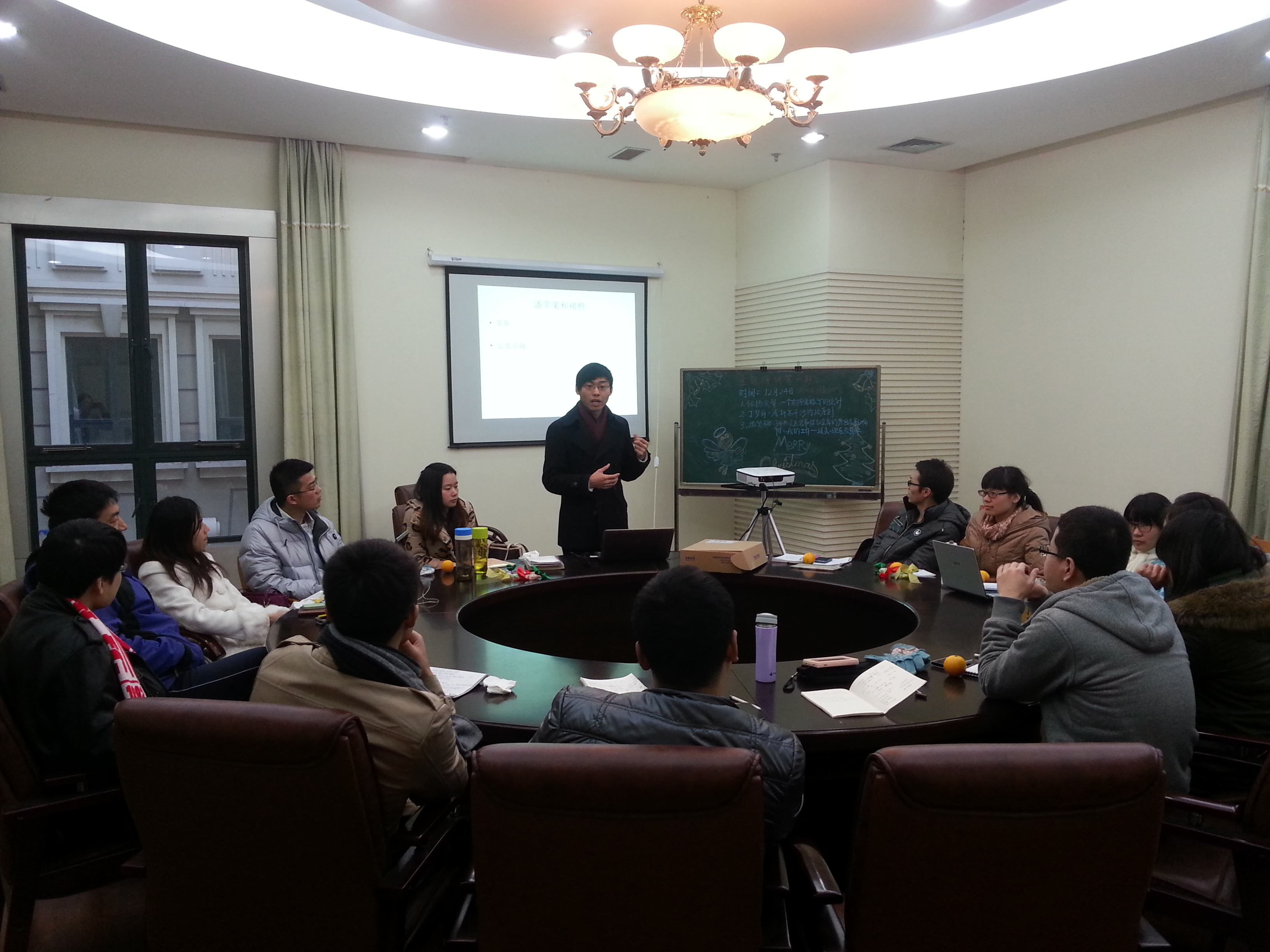 在“天使行动”进行的同时,8班学术小组会议也如期进行。本次会议由我班陈金州同学组织安排。作为主持人,他首先对举办班级学术小组会议的流程和定位做了简要介绍。学术小组选取三位有相对读博意向的同学作为核心成员,为他们提供一个主题呈现的平台。学术小组以“学术、实证、想明白说清楚”为定位标准,立足硕士研究生潜心学术的宗旨,“我们不是清谈馆,不是政客,作为立志要做学术的人,我们要从不同视角看待问题,从而形成我们充分的论据与论证”。