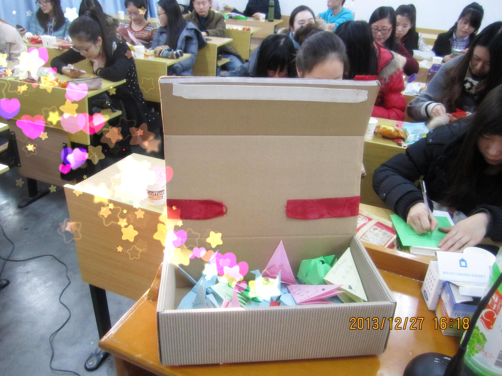 吃吃喝喝,笑过玩过以后,每个人都平静了下来,最后一个环节是写给两年后的自己。音乐声中,我们在班委准备的彩纸上记下此刻的心情,并写上对自己两年后的期许,折叠好后封存在纸盒里,期待两年后的再一次相聚,重新开启。也有不少人将心里的秘密写了下来,写给指定的那一个人,究竟是谁会在两年后收到这些秘密,我们谁都不知道,只知道当下的我们很开心,仍旧对未来有希冀,仍旧为锦绣前程而拼搏!加油,十六班!(文/毛逸 图/李婷婷)