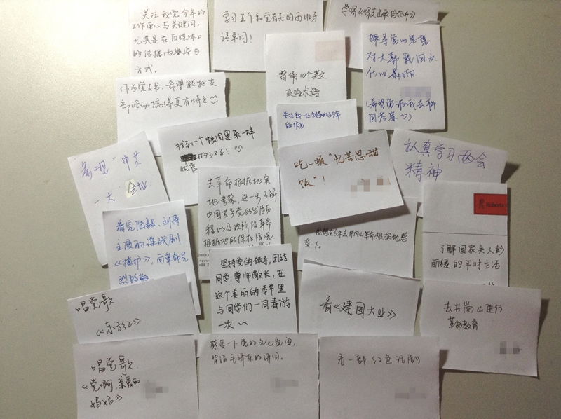 最后,每一位支部成员都许下了自己的承诺,这些承诺独具特色、充满个性化。有些承诺将党的知识和自己正在学习的语言结合起来,如“学习五个和党有关的西班牙语单词”、“背诵十个英文政治术语”;有些承诺彰显了作为新闻传播人关注时事的特征,如“了解国家夫人彭丽媛的平时生活”、“关注我党今年的工作重心和关键词”;还有些把党的愿望和自己的兴趣爱好结合起来,如吃货版的“吃一顿‘忆苦思甜饭’”,麦霸版的“学唱党歌《东方红》”,话剧迷的“看一部红色话剧”,旅友版的“去井冈山革命根据地感受一下”,以及单身女青年的呐喊“想找一个跟周总理一样优秀的男子”。
