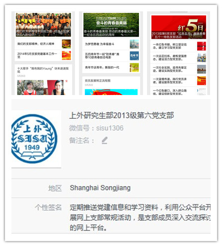 我支部于五四青年节之际,开通了微信公共账号(sisu1306),利用用户分组的功能开展“微党课”,定期向支部党员和入党积极分子传送学习资料和上级精神指示,变“集中学习”为“分散学习”,将学习时间化整为零。实现“手把手”地学习,点对点的“教育”,让更多的同学参与到党建活动中来。